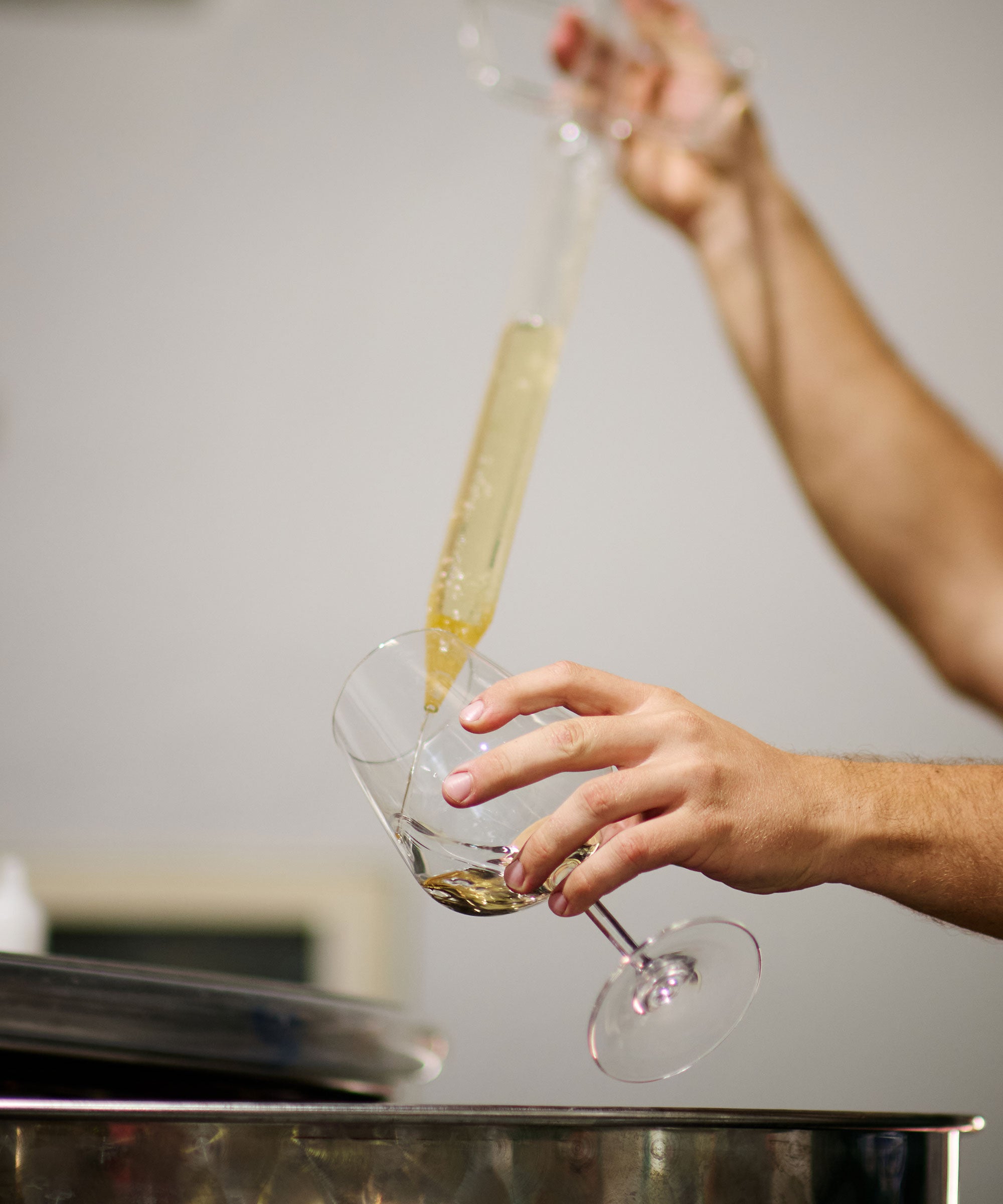 We follow the principles of permaculture, working with the land rather than against it. Between the vine rows, we plant olive and fruit trees that provide shade and break the wind – an agroforestry system that grows gradually over time. Grasses, herbs and wild plants fill the spaces in between, increasing biodiversity and helping the soil retain water. The sheep and goats of a village shepherd keep the grass short and fertilise it naturally. We give the soil the time it needs to regenerate – practising a form of viticulture that not only protects the land, but rebuilds it and gives something back to it.